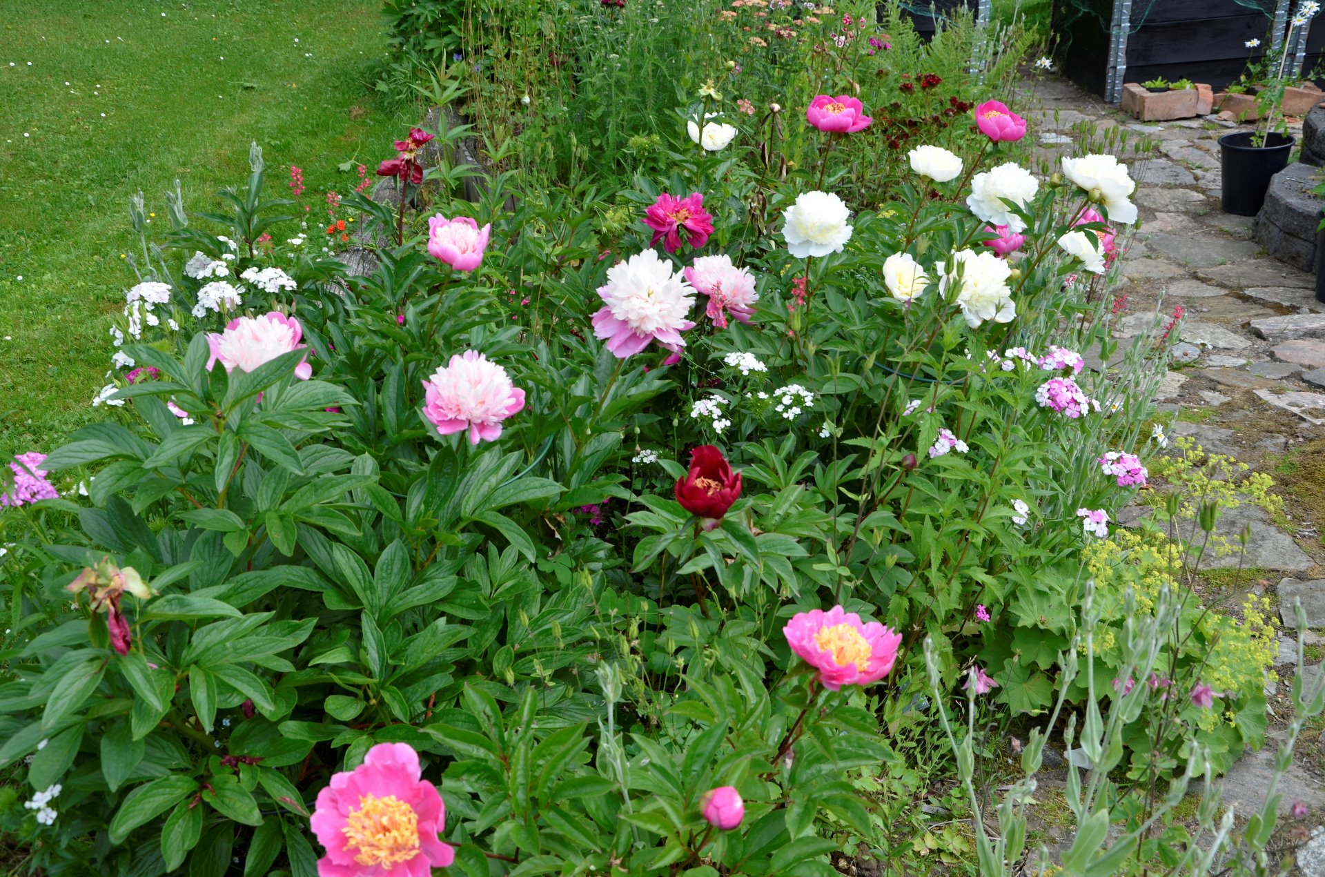 Genom att välja pioner med olika blomningsperioder så kan man få se blommor från slutet av - slutet av juli.